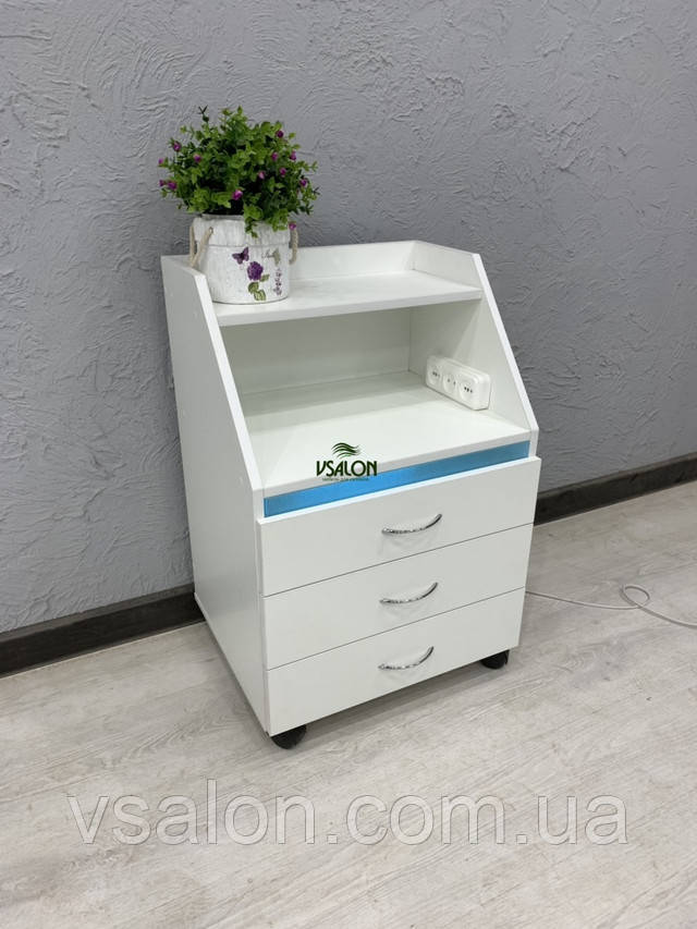 * в тумбі три висувні ящики і закрита ніша з дверцятами, у верхній ящику встановлена УФ лампа